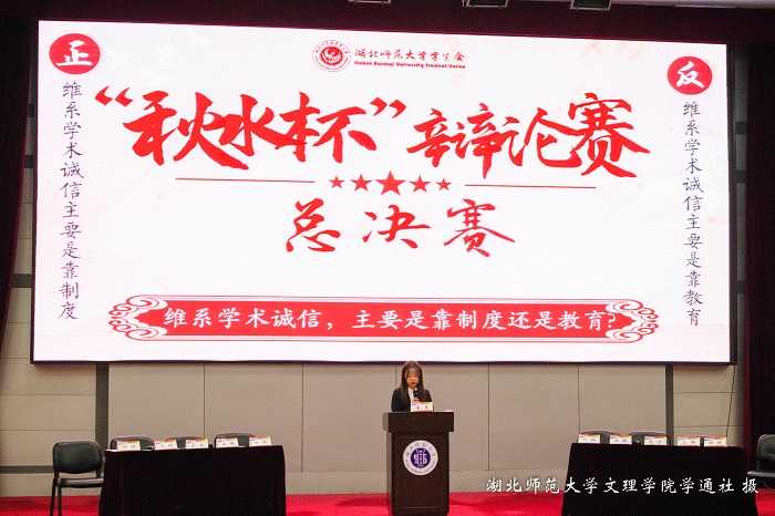 乐鱼(中国)官方参加总决赛的四位辩手是吴明月、王秀静、叶妙、曾佳宜,她们和湖北师范大学马克思主义学院代表队分别作为正反双方,就“维系学术诚信主要是靠制度还是教育”这一辩题展开了激烈的争锋。针对辩题,双方在对辩、盘问和自由辩论环节都展开了激烈的攻辩。比赛中,双方辩手以良好的风范、出色的口才、敏捷的思维令全场观众为之折服,为之喝彩。