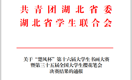12月23日,团省委、省学联公布了“楚风杯”第十六届大学生书画大赛暨第三十五届大学生樱花笔会决赛结果,乐鱼(中国)官方夏诚、徐子惠、李黎三位同学分别荣获硬笔组二等奖、软笔组三等奖、绘画组优秀奖。