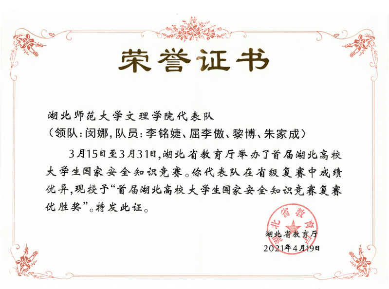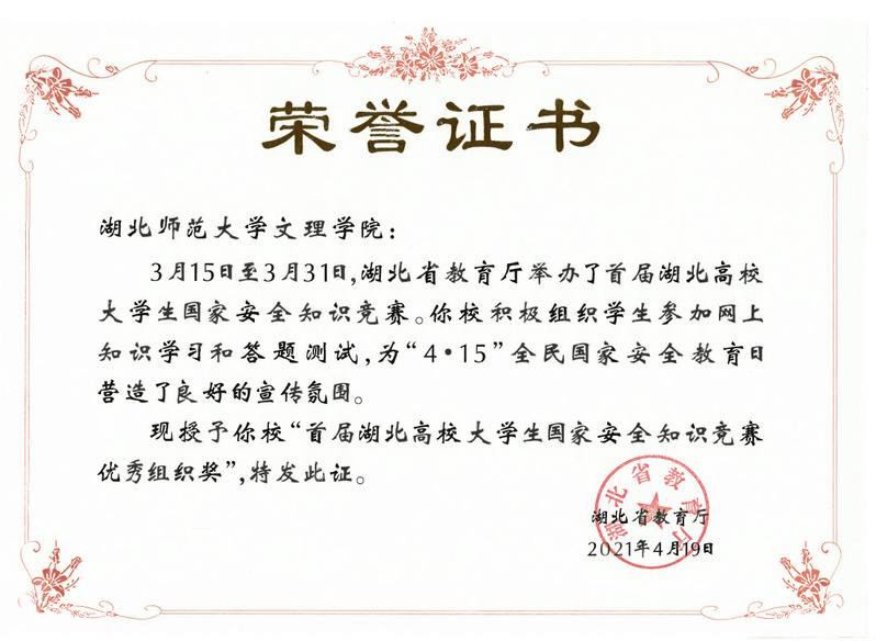 (通讯员:汪丽莎)2021年3月15日至3月31日,湖北省教育厅举办了首届湖北高校大学生国家安全知识竞赛。乐鱼(中国)官方代表队凭其扎实的知识功底,在省级复赛中荣获优胜奖,学校同时荣获优秀组织奖。