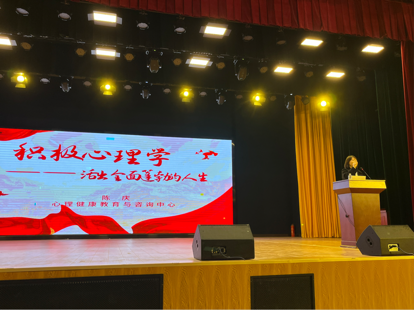 2023年11月9日19:00,乐鱼(中国)官方心理中心在学术交流中心成功举办了“积极心理学”讲座活动。本次讲座由心理中心主任陈庆主讲,近700名来自于八个学部的学生观看了此次讲座