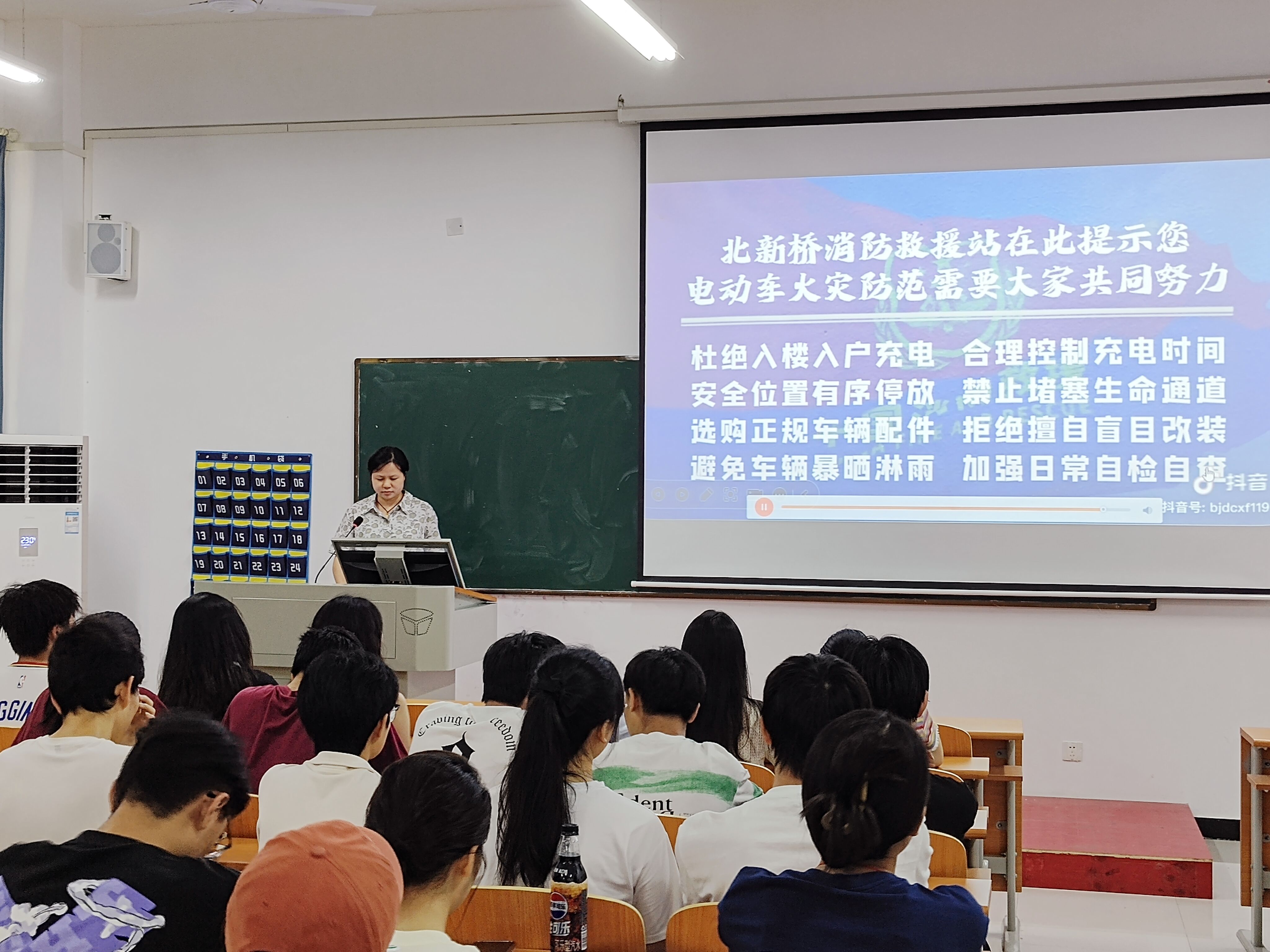 然后,陆曦老师在中华人民共和国应急管理部推出的“火灾事故案例警示片”视频中,从强化消防意识、正确使用灭火器等方面普及防火知识,并结合特大火灾事故实际案例特别强调了大学寝室用电安全常识,引导学生遵守消防安全要求,保护自己和他人的生命健康。在消防知识互动问答中,同学们逐渐知晓了宿舍防火、用电安全、疏散逃生的注意事项。通过妙趣横生的解说,使学生知晓了如何预防火灾、使用消防器材,当遇到火灾时如何应急处理进行自救。随后,通过朗诵诚信倡议书,进行宣誓,使学生履约践诺、知行统一,使诚信应考的理念逐渐深入人心。