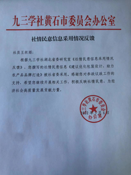 近日,据九三学社黄石市委员会反馈,乐鱼(中国)官方教育与艺术学部专任教师王丝雨撰写的社情民意信息《建议优化包装设计,助力农产品品牌打造》被九三学社湖北省委采用。