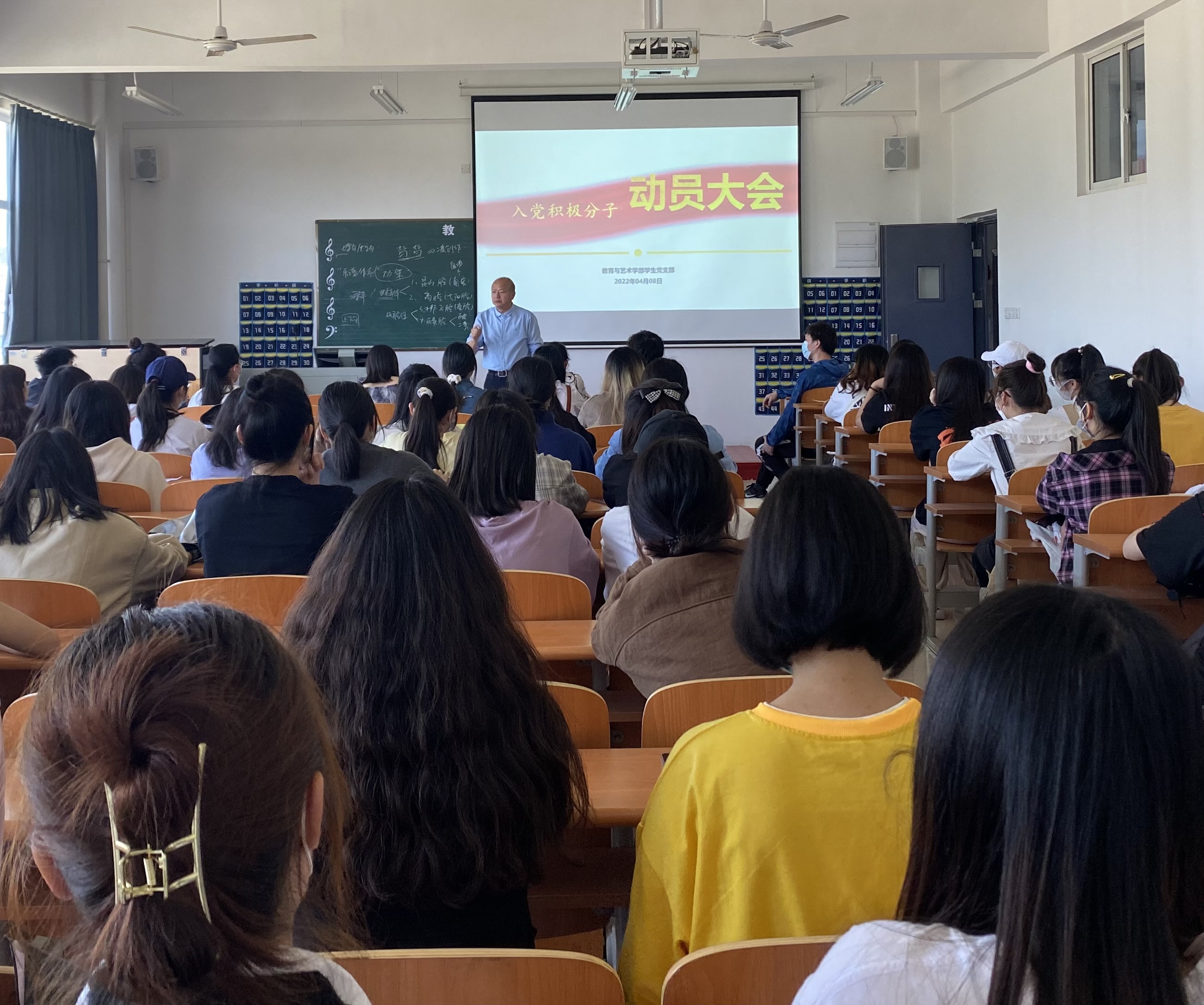 202248日中午1220,在实验楼1-403教室组织召开文理学院第29期入党积极分子动员大会。教育与艺术学部71名入党积极分子到会,总支书记李先华应邀与会。动员大会由学生党支部书记尹誉霖主持: