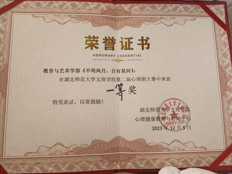 2023年12月5日,大学生心理健康教育与咨询中心在学术交流中心举办的“心如花木,向阳而生”为主题的心理剧决赛,我学部小学教育2202班杨璨宇等9位同学,演绎的《不苟风月,自有星河》心理剧荣获一等奖和最佳剧本奖。特此祝贺!