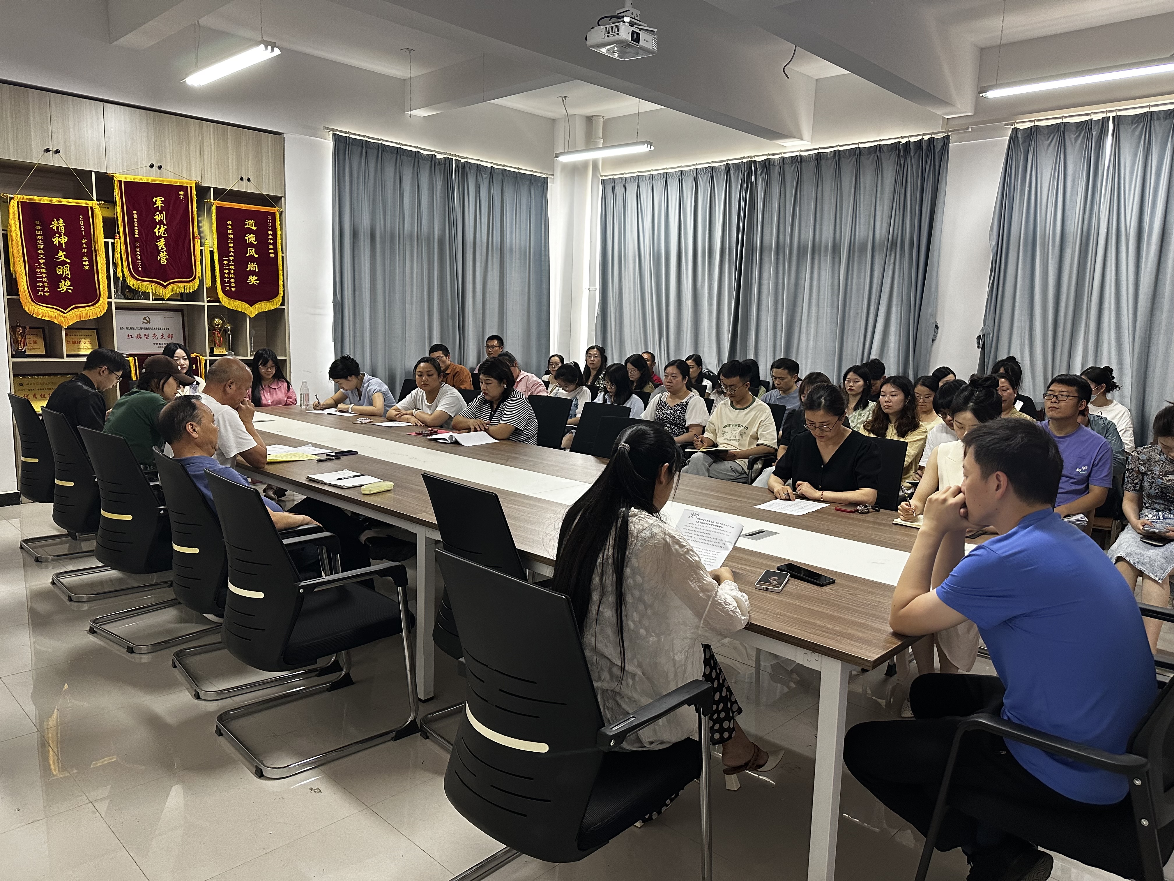 2024年6月3日中午12:00,教育与艺术学部在1号实验楼414会议室召开了全体教职工工作例会,本次会议共有以下四项议程:1.全体教职工集中开展政治理论学习,张卓老师和陈依恒老师领学;2.李先华书记安排了学生管理相关工作,重点强调了安全问题和毕业生相关工作;3.王文主任就学科竞赛、教科研活动、期末考试、中国国际大学生创新大赛项目申报等方面进行了6月份重点工作的部署;4.各专业教研室组织开展教研室活动。