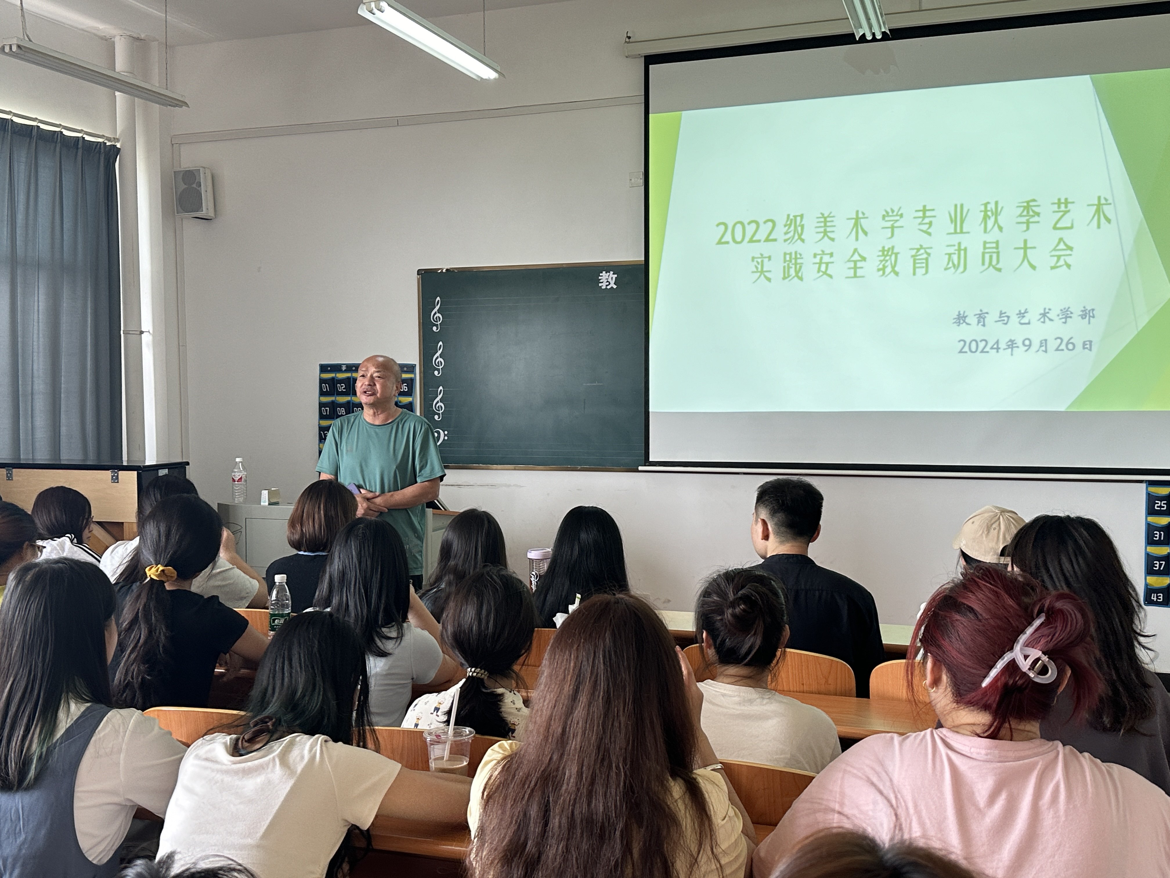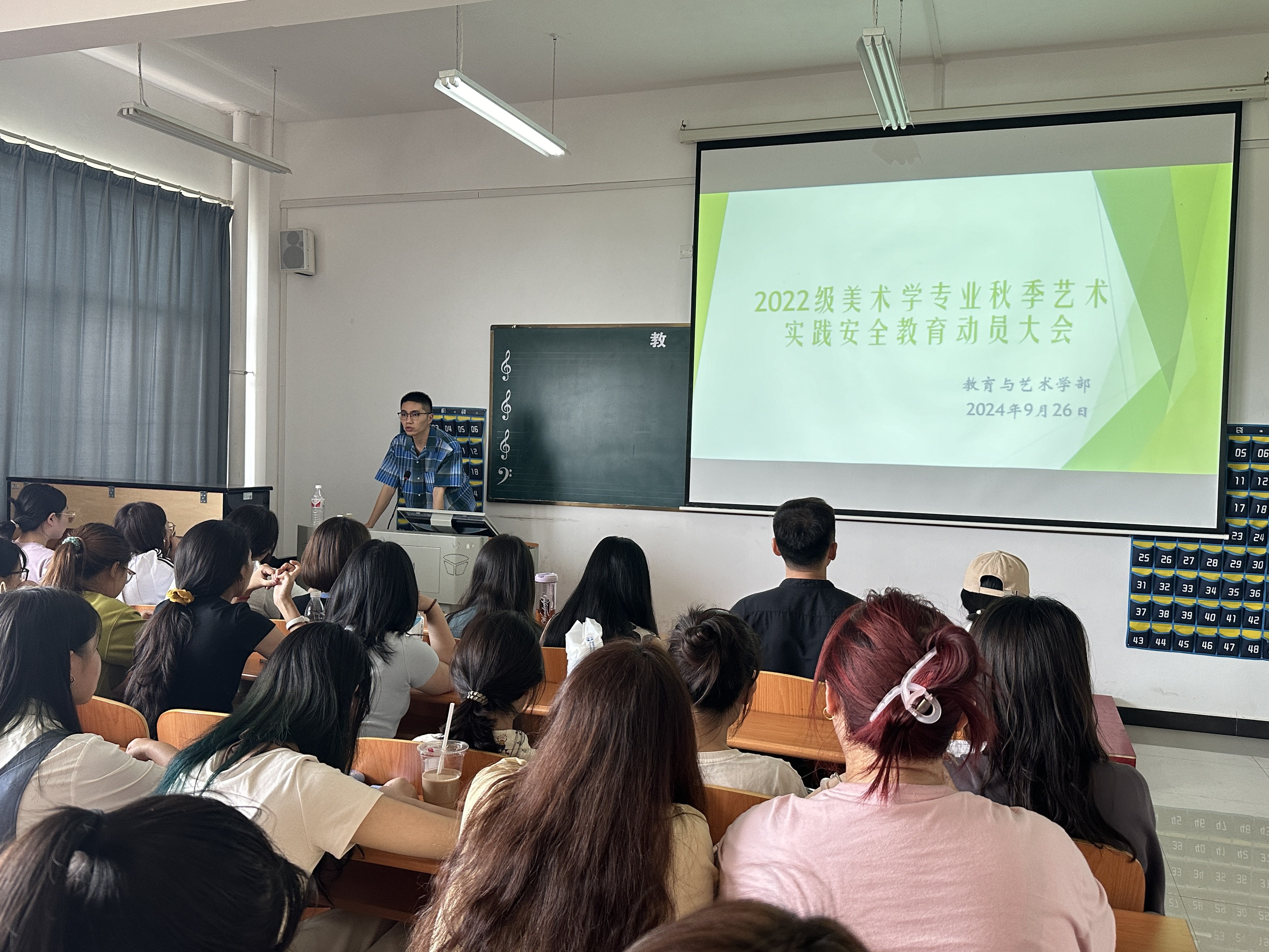 按照人才培养方案的要求,2024年秋2022级美术专业学生即将赴云南进行艺术实践。为确保艺术实践安全有序的进行,2024年9月26日中午12:00,教育与艺术学部在实验楼1-403召开了艺术实践安全教育动员大会。学部总支书记、带队老师及2022级美术学专业全体学生参加了动员大会。