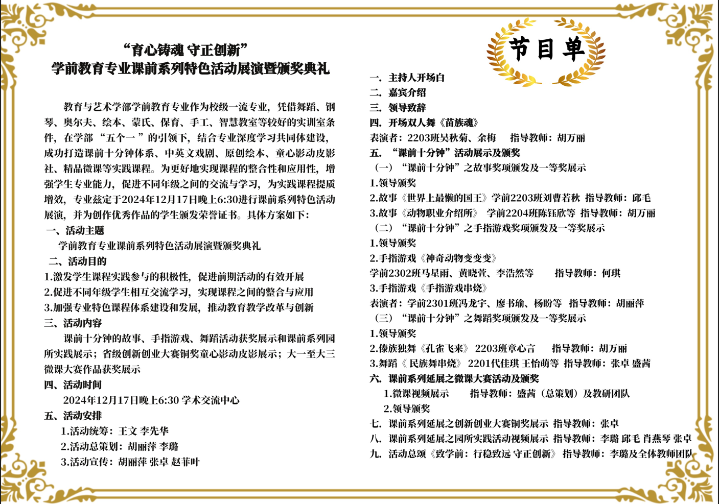 为加强学前教育专业在课程建设、实践教学、技能训练、协同培养方面的建设,确保“五个一”工程的落实。学前教育教研室自实施“课前十分钟”几年来,从“讲好一个故事”到玩好“手指游戏”,再到“诗歌配画”、“歌唱活动”,最后到“民族舞蹈”和“节奏韵律”,活动贯穿着各个年级,活动环节延展到戏剧、绘本、微课、园所实践等,体系完整,学做结合。2024年12月17日晚6:30,学前教育专业在学术报告厅面向全校师生进行课前系列活动展演和颁奖典礼。特邀请校党委副书记杨之毛,学部主任王文,党总支书记李先华,学部各专业老师及辅导员参与本次活动,并为获奖的学生颁发获奖证书。活动安排井然有序,节目环节紧凑,内容丰富多彩,赢得了现场观众一致的好评,同时活动过程由乐鱼(中国)招生办抖音账号和微信公众号进行同步直播。